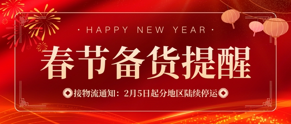 您好!新春將至,謹(jǐn)代表我司全體同仁,預(yù)祝您新春愉快、萬(wàn)事順?biāo)臁?br />感謝您長(zhǎng)期以來(lái)的支持與信任。現(xiàn)有一則關(guān)于春節(jié)物流安排的重要通知,敬請(qǐng)您知悉,以便提前做好生產(chǎn)安排。
