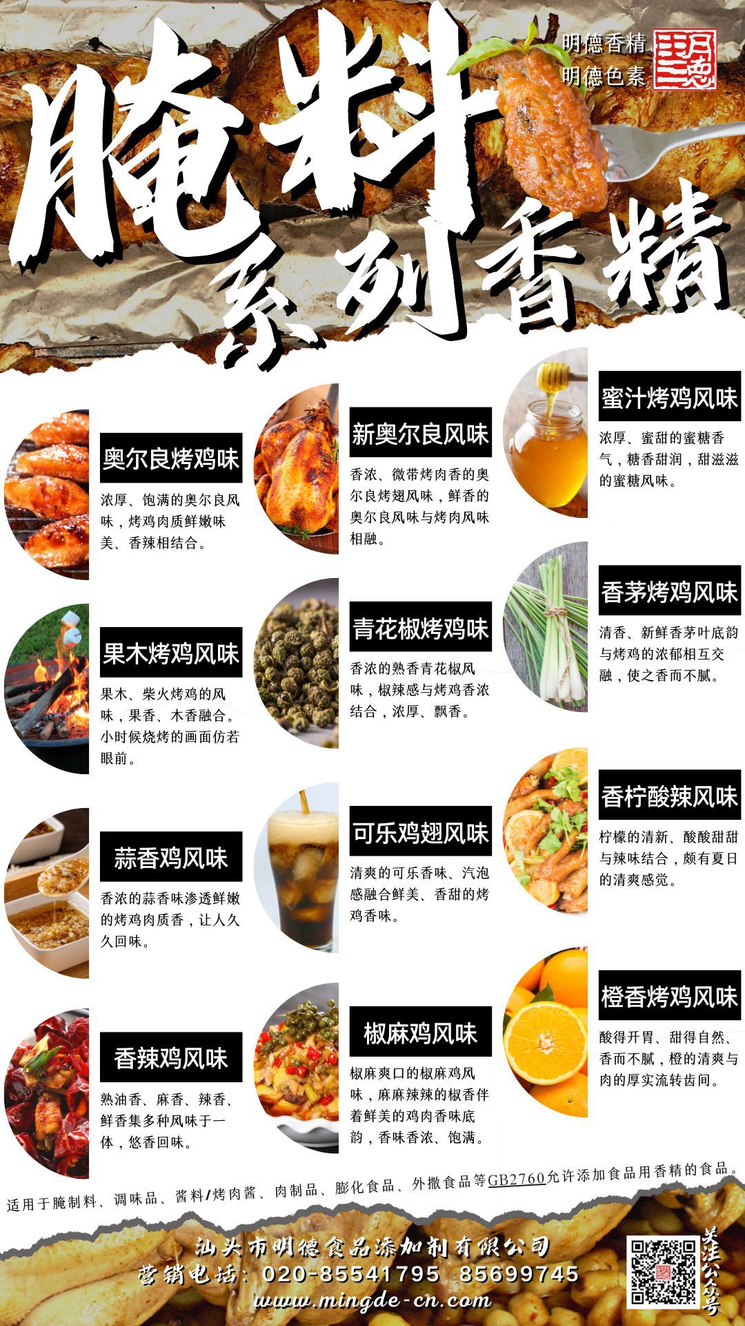 在雞肉香精領(lǐng)域我們潛心專研,結(jié)合市場潮流,消費(fèi)者喜好,汕頭市明德食品添加劑有限公司現(xiàn)有以下16種雞肉相關(guān)風(fēng)味的香精,供您選擇。并持續(xù)努力研發(fā)更多符合市場需求的風(fēng)味。