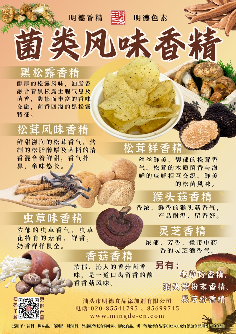 汕頭市明德食品添加劑有限公司的菌類(lèi)風(fēng)味香精系列,涵蓋黑松露、松茸、蟲(chóng)草、猴頭菇、靈芝、香菇等多種風(fēng)味,并配有粉末型產(chǎn)品。產(chǎn)品菌香真實(shí)、留香持久、層次豐富,適用于湯料包、醬料、調(diào)味品、肉制品、腌制料及外撒粉、復(fù)合調(diào)味料,膨化食品、餅干等焙烤食品等B端應(yīng)用,幫助工廠打造具有辨識(shí)度的菌類(lèi)風(fēng)味產(chǎn)品。